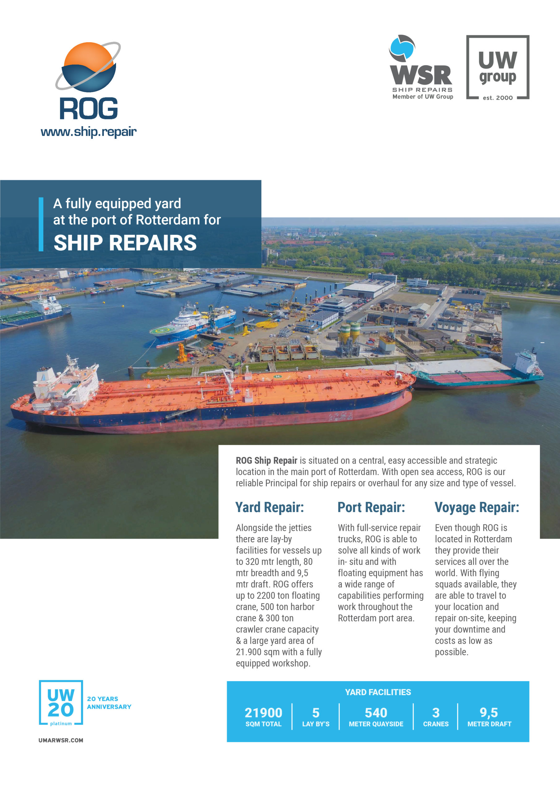 ROG Ship Repair is a ship repair company, with an open sea accessible, strategic and ISPS location in the main port of Rotterdam.